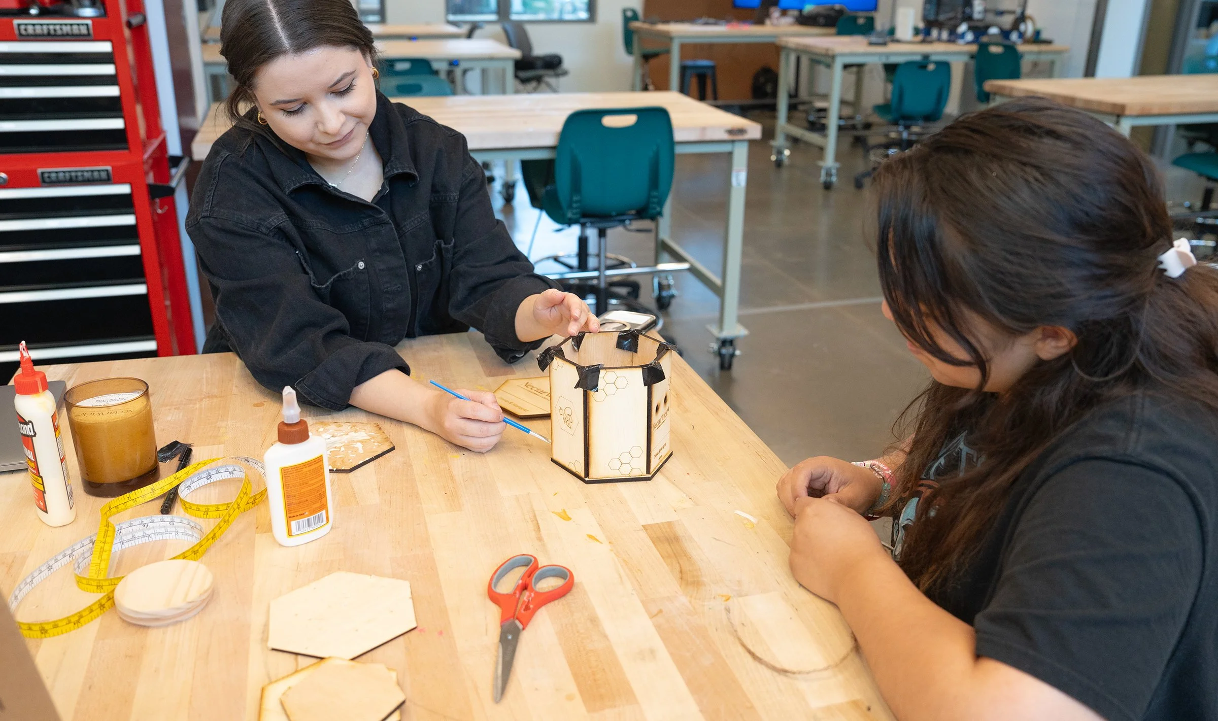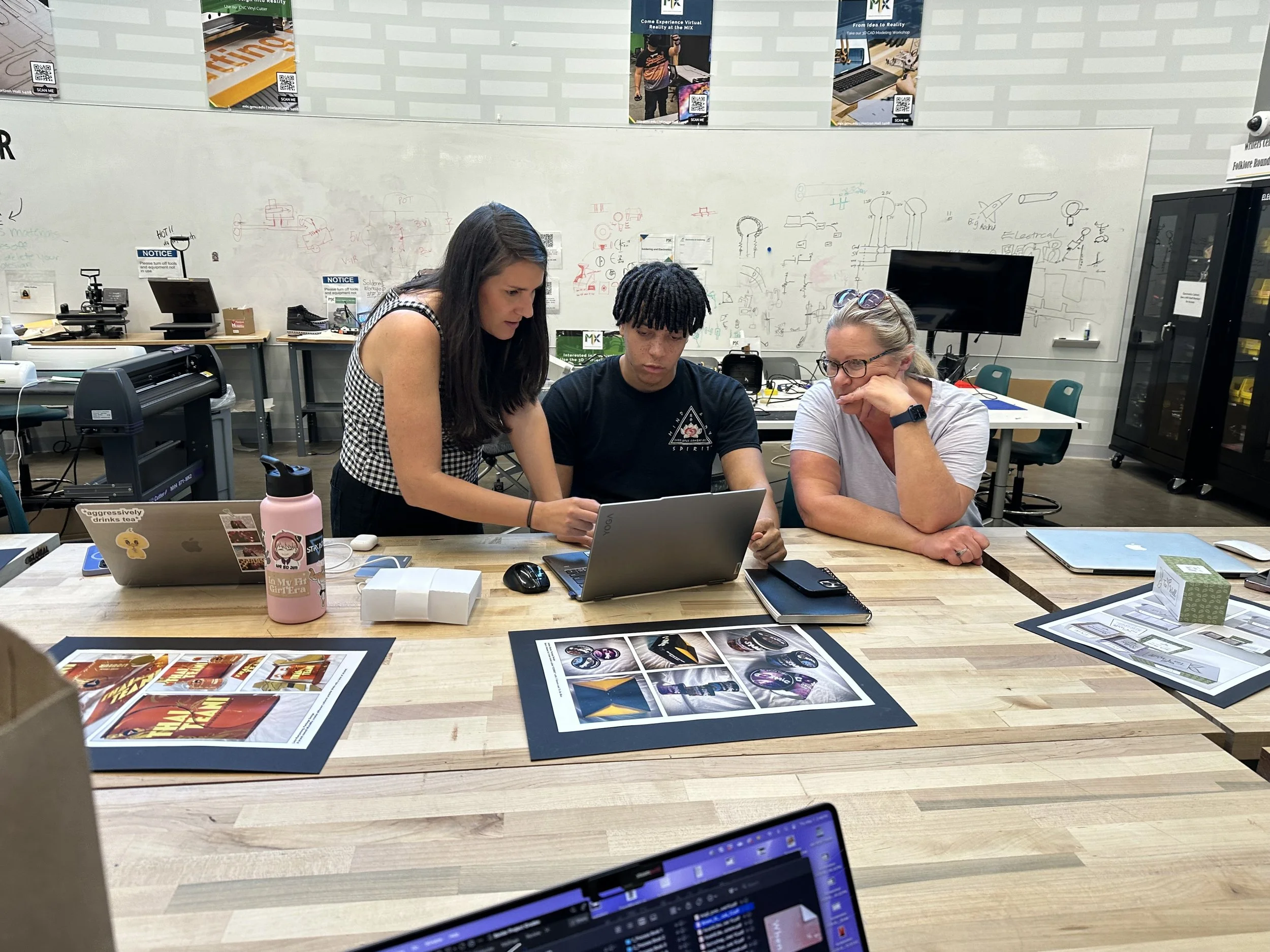 Professor Ana Farnham working with her MIX Package Design with Digital Fabrication badge-earning students.